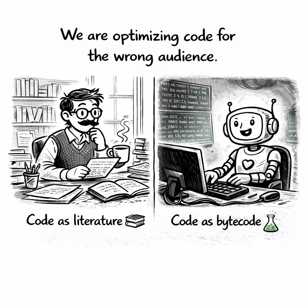 Code is now generated more than it is written. It is traversed by machines before it is ever read by humans. It is modified, expanded, and reorganized by systems that do not need meaningful names or carefully crafted layers to understand what is happening.